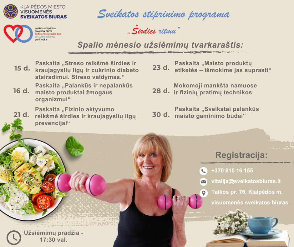Spalio mėnesį kviečiame dalyvauti nemokamoje sveikatos stiprinimo programoje „Širdies ritmu“! Tai puiki proga pasirūpinti savo fizine bei emocine sveikata, kuri garantuoja energiją ir gerą nuotaiką!