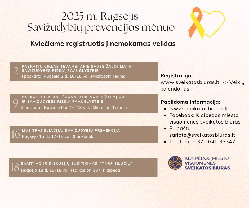 Rugsėjis- tarptautiniu mastu pripažintas kaip savižudybių prevencijos mėnuo, tad paminėdami šį laikotarpį organizuojame įvairias veiklas skirtas informavimui apie savižudybių prevenciją bei įkvėpimui visada turėti vilties ir rinktis gyvenimą. Šios veiklos yra nemokamos ir daugiau informacijos apie jas galite rasti žemiau: