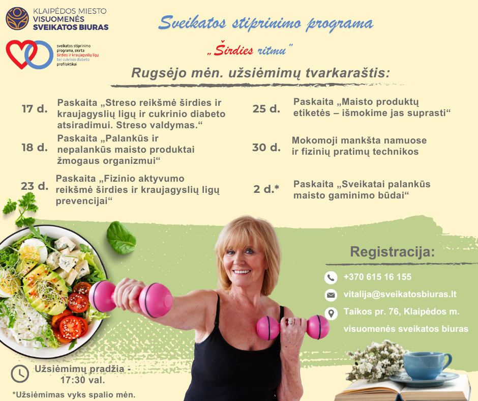 Rugsėjo mėnesį kviečiame dalyvauti nemokamoje sveikatos stiprinimo programoje „Širdies ritmu“! Tai puiki proga pasirūpinti savo fizine bei emocine sveikata ir pastikti rudenį kupiniems energijos ir geros nuotaikos!
