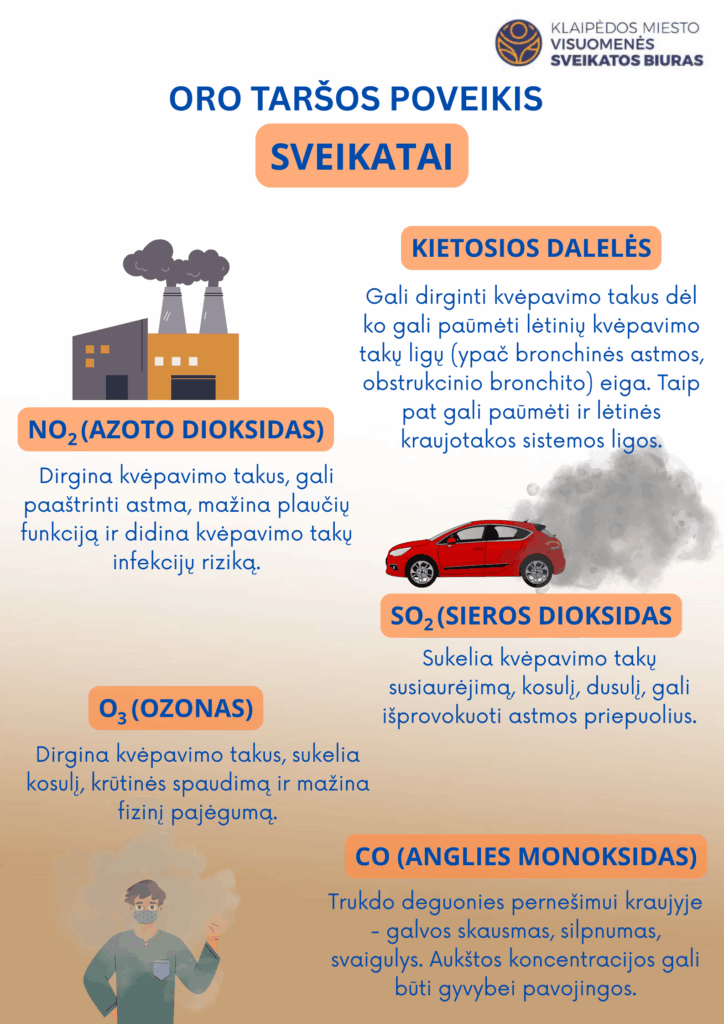 - Lietuviai apie 90 proc. kilometrų nukeliauja automobiliais. Automobiliai dideliuose miestuose yra pagrindinis atmosferos teršimo šaltinis. Teršalai ardo bronchų, plaučių ląsteles, sumažėja atsparumas virusams ir bakterijoms. Pasaulinės sveikatos organizacijos duomenimis, sumažinus oro taršą 50 proc., gyventojų amžius pailgėtų 3–5 metais, sergamumas vėžiu ir kvėpavimo sistemos ligomis sumažėtų 20–30 proc., o kraujotakos sistemos ligomis – apie 10 proc.